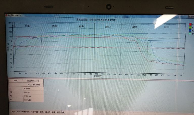 a噴涂生產(chǎn)線測溫 預(yù)熱設(shè)定120℃ ,烘烤5分鐘后溫度在90-120左右 ,沒有在±5的溫度范圍內(nèi),烘干線5節(jié)烤箱都設(shè)定170℃ ,只有 234節(jié)烤箱烤箱基本能在160-175這個溫度范圍內(nèi),沒有在總烘烤時間設(shè)定15分鐘, 需有12分鐘在165-175這個時間段內(nèi) b線測溫第一二節(jié)烤箱。
