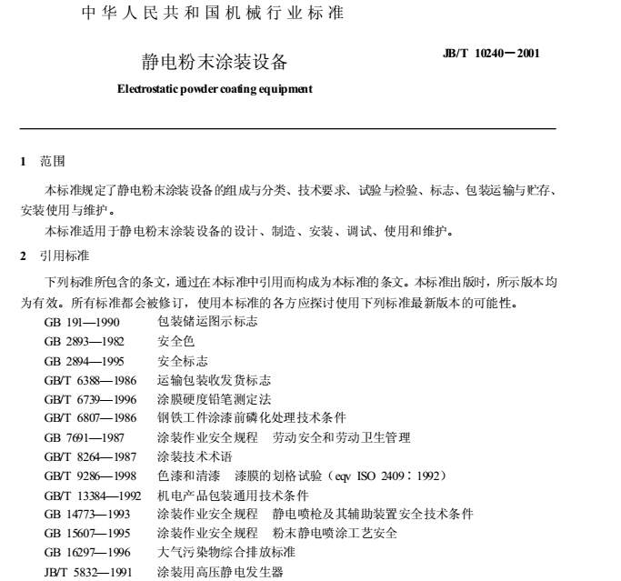 噴涂行業(yè)標(biāo)準《靜電粉末涂裝設(shè)備》JB-T10240-2001